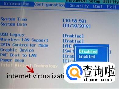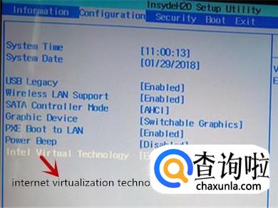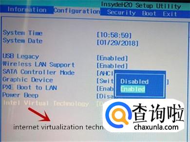 移动到“configuration"时,使用向下的箭头移动到”internet virtualization technology",使用“enter”键选择 “enabled"然后确定即可。