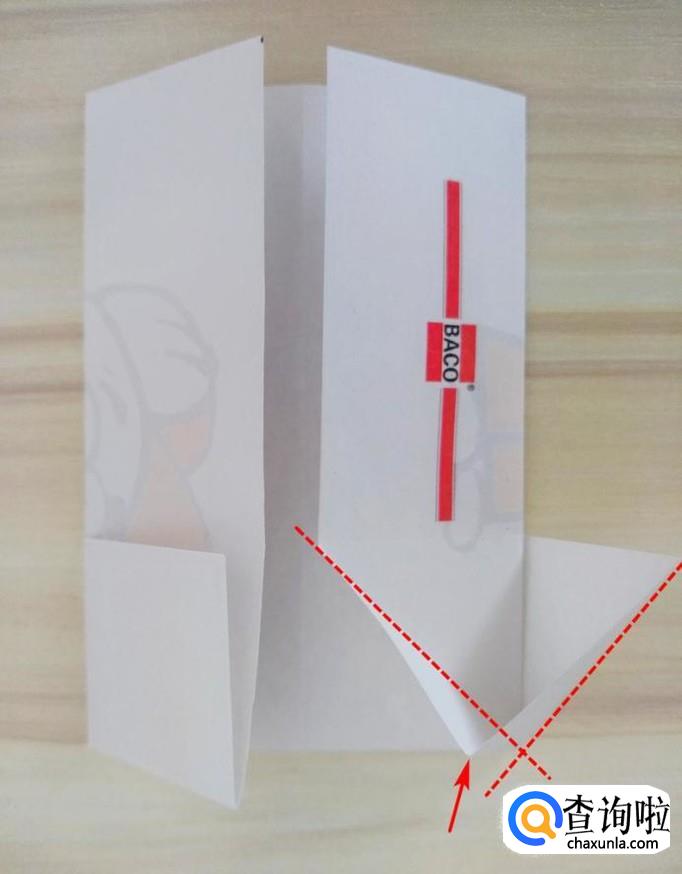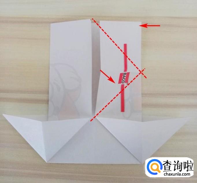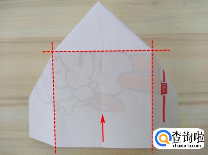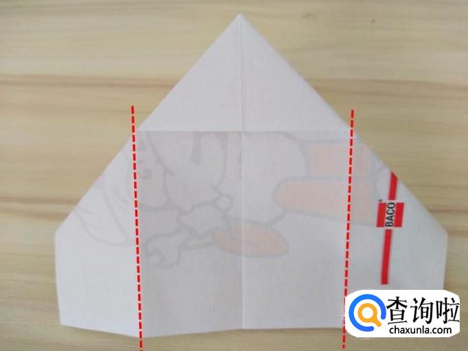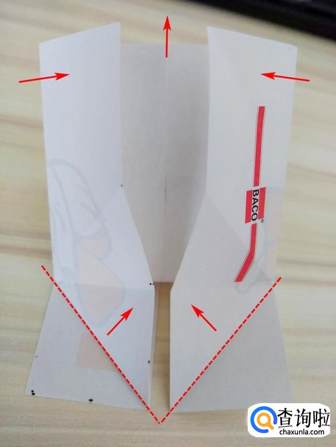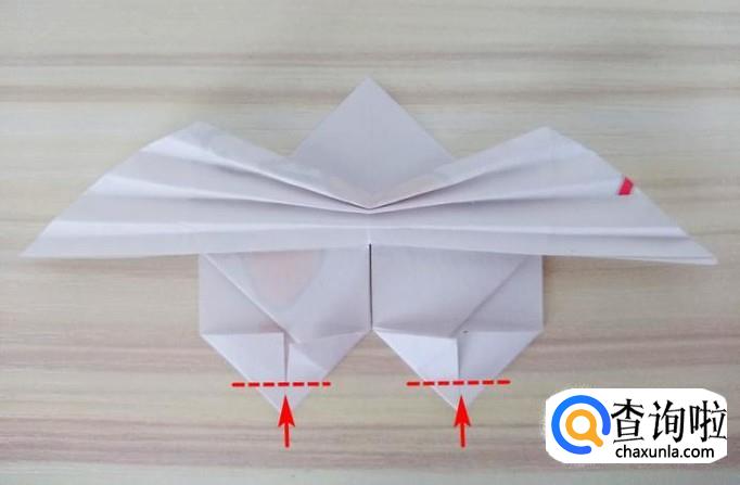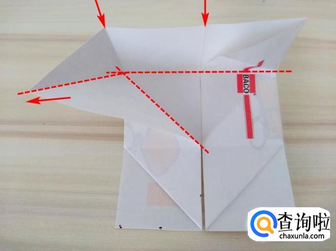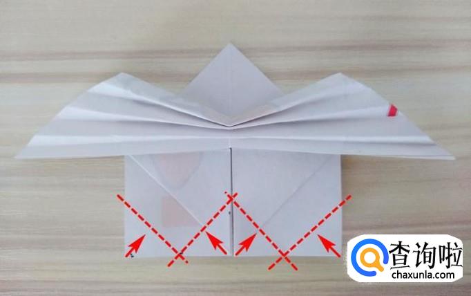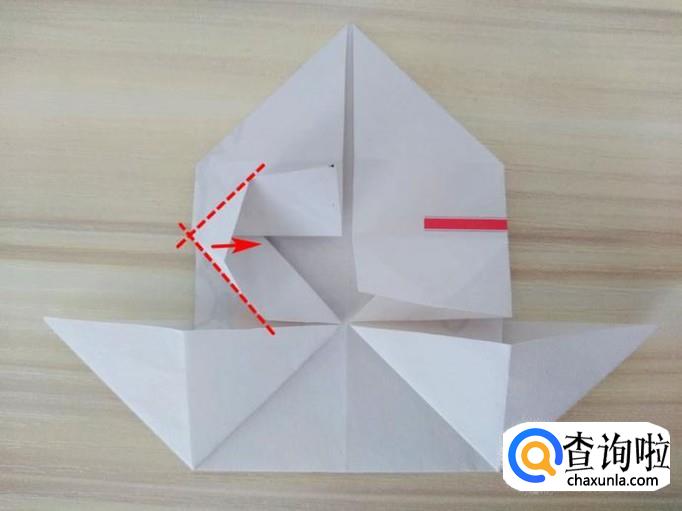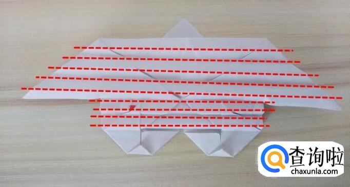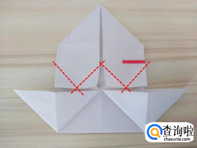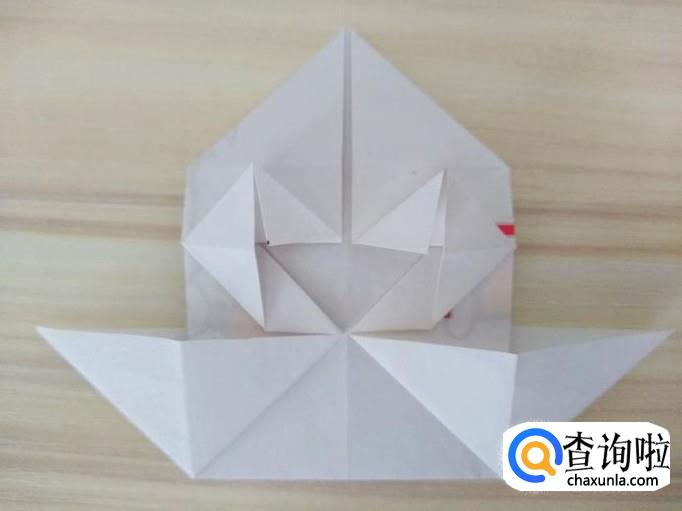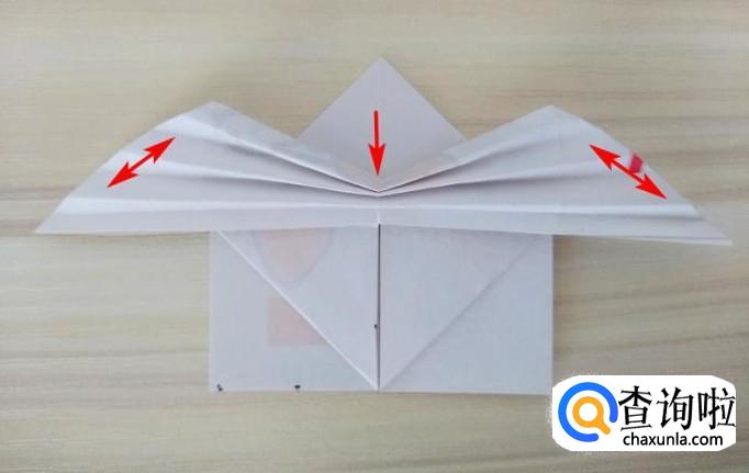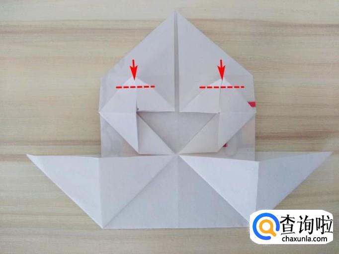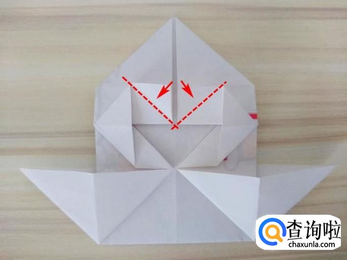 上方部分的右侧沿着虚线,中间提拉,上面的角往回折,左侧同样折法,最后上方形成一个尖角;