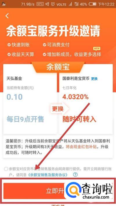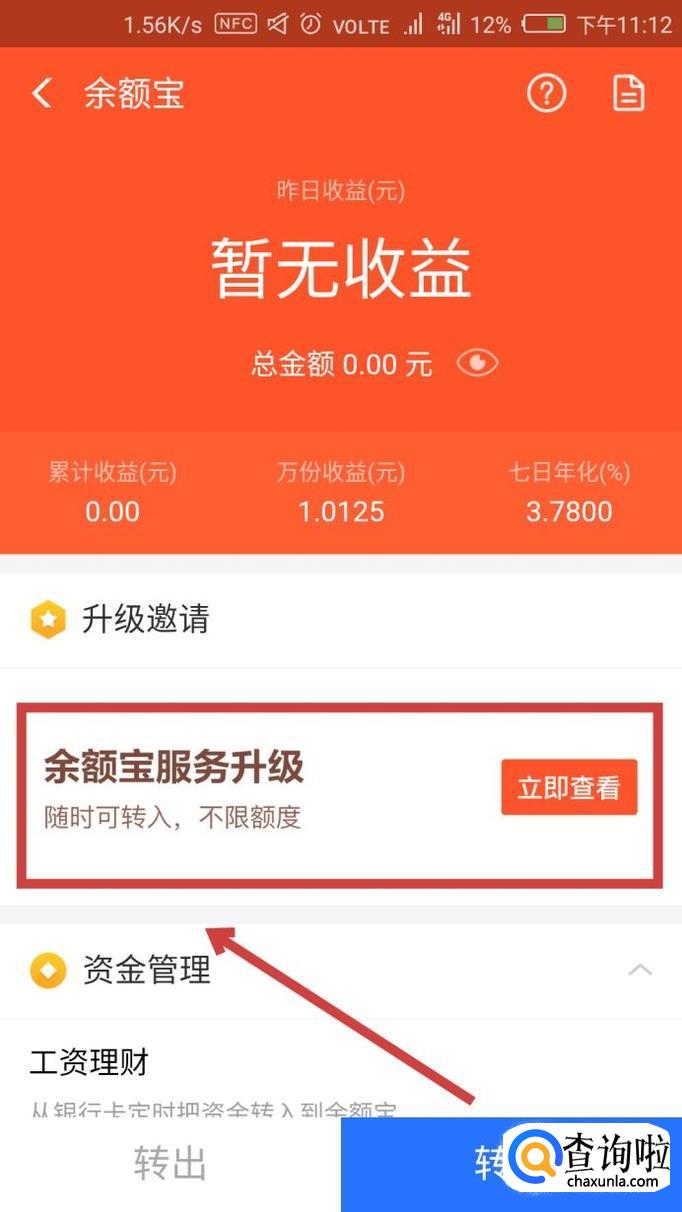 向下翻,我们可以在界面中找到【余额宝服务升级】,点击进入。