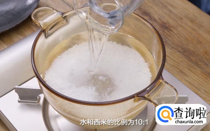 往锅里倒入西米,然后再倒入一锅冷水,水和西米的比例为10:1,开到大火煮沸后再煮5分钟左右,即可关火。