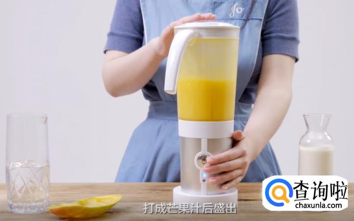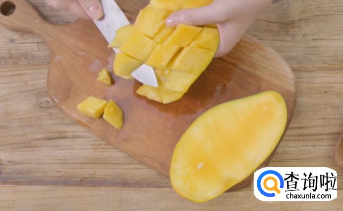 接下来,将芒果肉切块,取一部分放入搅拌机,再混合糖水打成芒果汁后盛出。