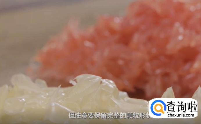 做杨枝甘露需要用到两种柚子,分别是蜜柚和西柚。将这两种柚子分别剥肉,指腹轻轻搓柚子肉使其分离,但要注意保留完整的颗粒形状。