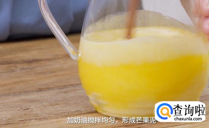 盛出芒果汁后,加入奶油均匀搅拌,形成芒果泥。