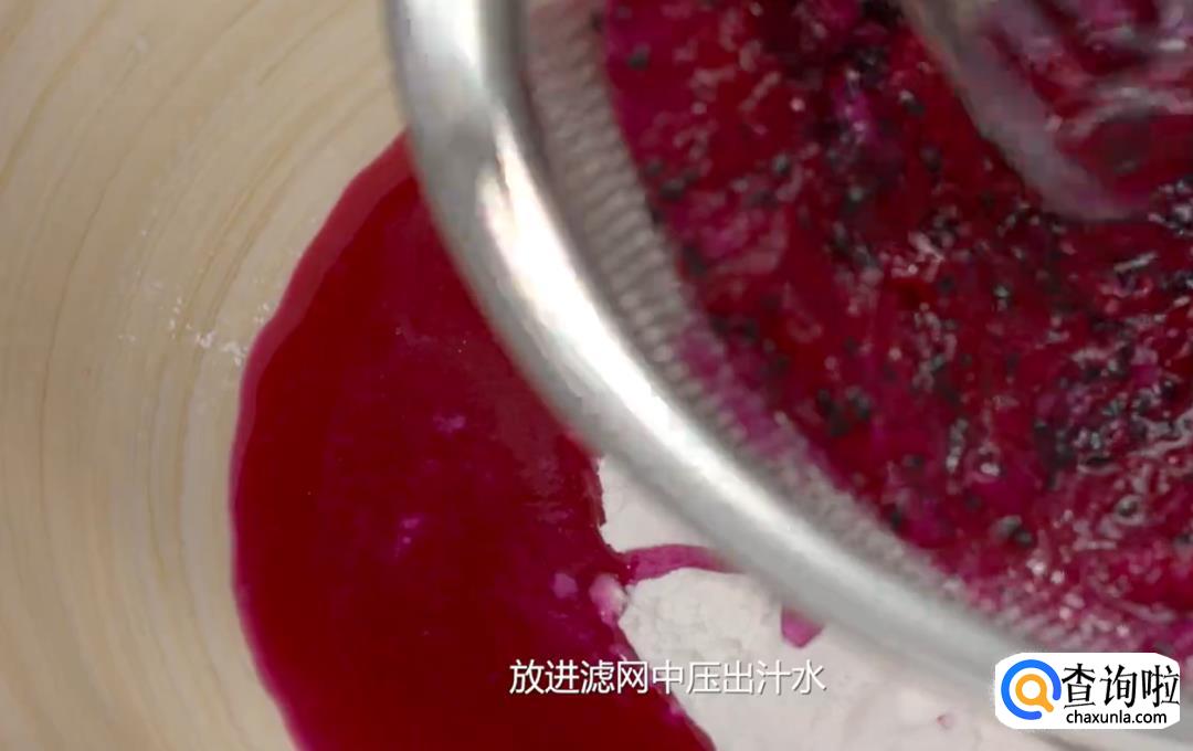 搅拌盆里放入糯米粉,然后把火龙果肉取出来放到滤网里,把汁水压到糯米粉里。