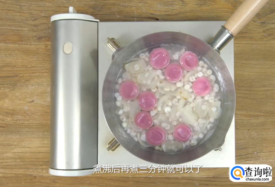 锅里放入清水和鸡头米煮软后加入新鲜百合和冰糖,冰糖融化后加入小饼一起煮3分钟即可。