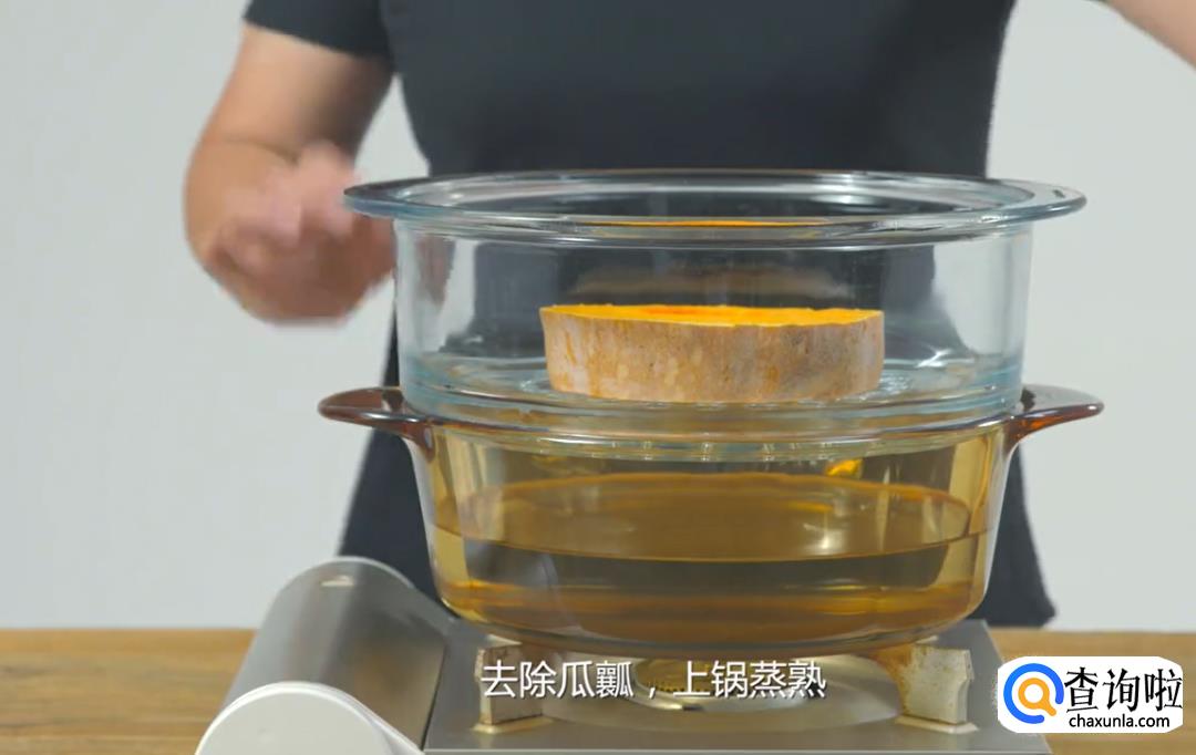 老南瓜去除瓜瓤后上蒸锅蒸熟。