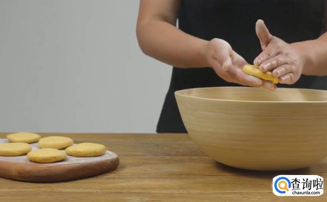 蒸熟的南瓜加入糯米粉和一点水,揉面到面团有韧劲,然后取一小部分用手掌压成饼状。