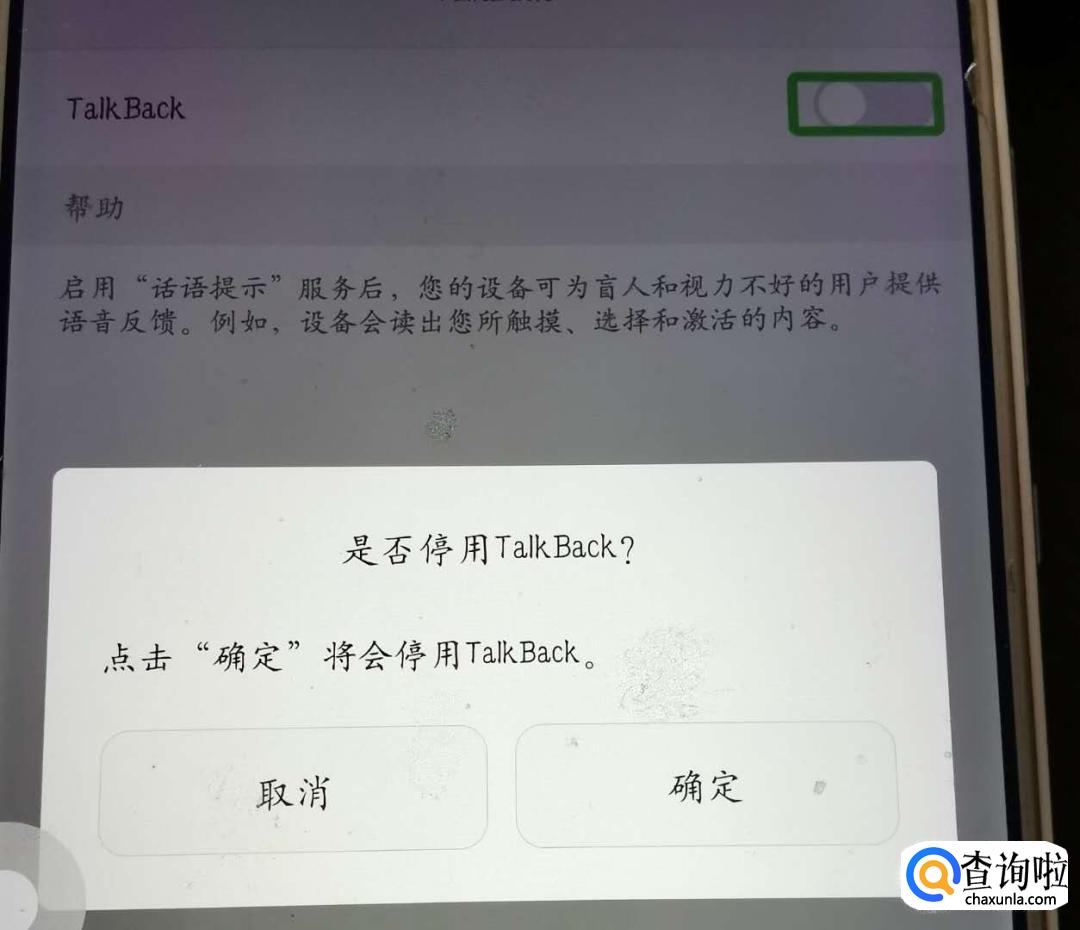 在【TalkBack】窗口中,点击确定将【TalkBack】选项的开关关闭。