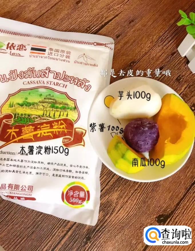 食材:木薯淀粉150克,紫薯100克,芋头100克,南瓜100克。