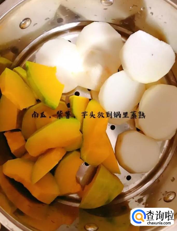 首先将南瓜、紫薯和芋头全切成块,上锅蒸15分钟,如下图所示。