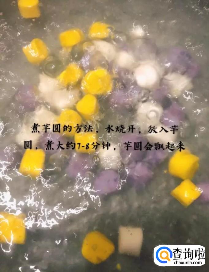 接着在锅中放入馅的清水,待水烧开,放入芋圆煮大约七到八分钟,芋圆飘起来就可以了。