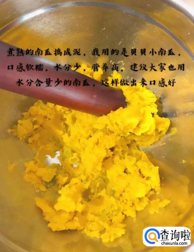 接下来把蒸熟的南瓜捣成泥,如下图所示。小贴士:小编以南瓜芋圆为例,紫薯芋圆和芋头芋圆的做法是一样的。
