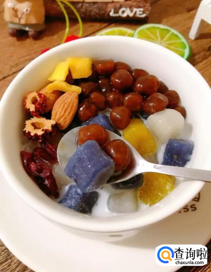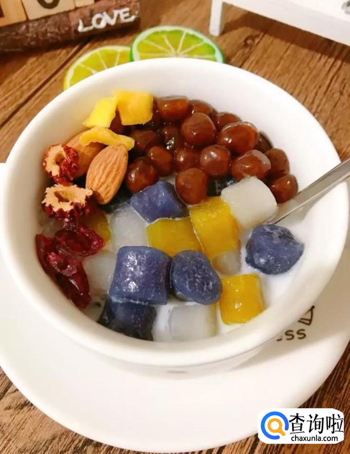 最后在煮好的芋圆中加入牛奶和干果等就可以了,美味可口的小甜点芋圆就做好了,希望大家能够喜欢。你学会了吗?赶快动手试一试吧!