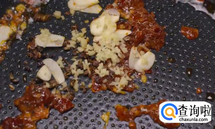 再加入花椒粒、姜末和蒜片进行翻炒。