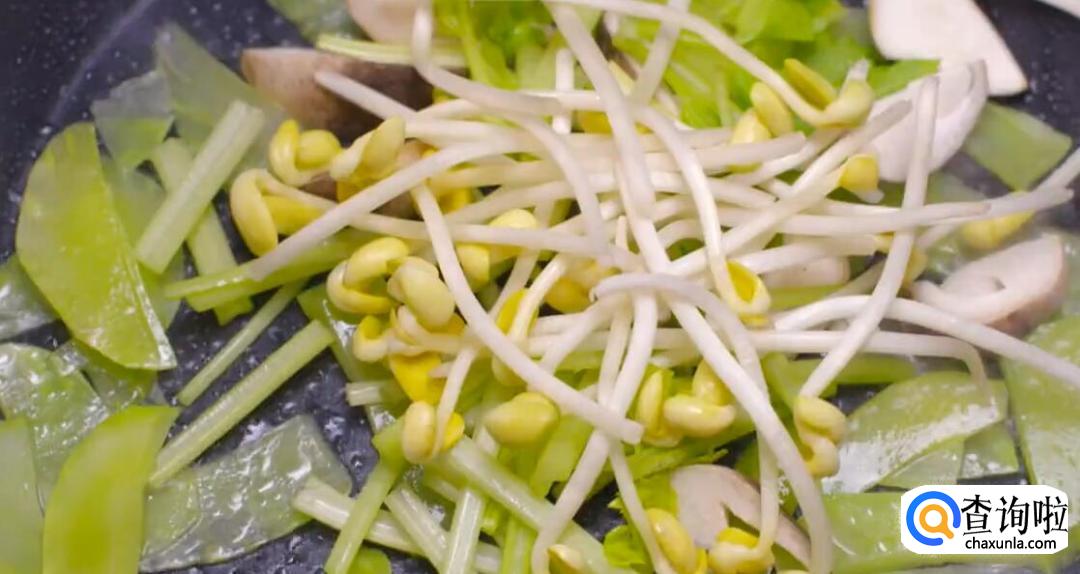 接着准备素菜。莴笋片、芹菜、草菇、豆芽、切碎的莴笋叶子。
