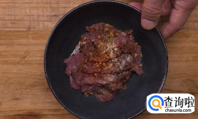 肉片用黄酒、辣椒粉、花椒粉、盐先腌制起来,这样煮出来才有底味。