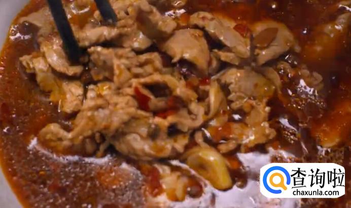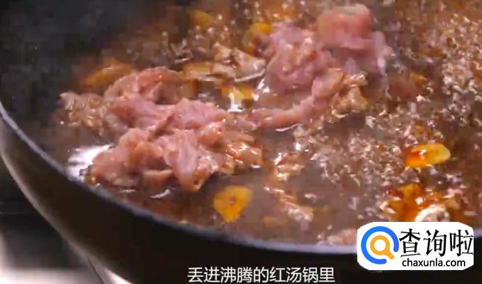 把肉片抓散,丢进沸腾的红汤锅里。