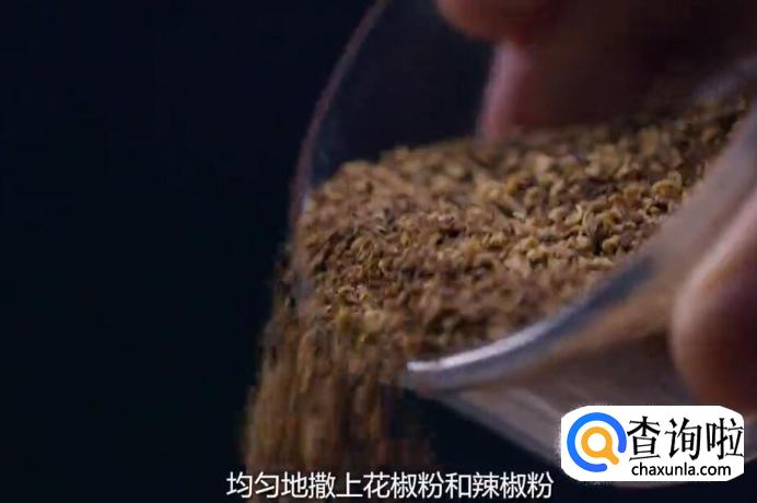 然后均匀的撒上花椒粉和辣椒粉。