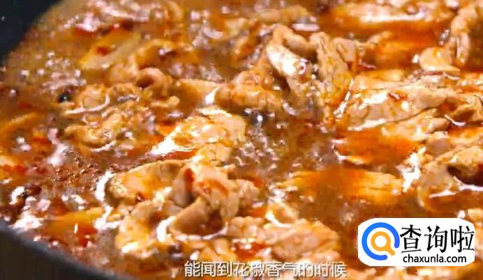 然后再加两勺花椒油,能闻到花椒香气的时候,证明花椒油的量够了,肉片很快很变色,随即断火。