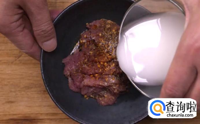 然后将生粉倒进肉片里拌匀。挂桨是为了防止肉片在高温时脱水,但一定只需要薄薄的一层就可以了。