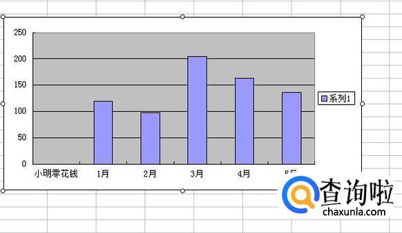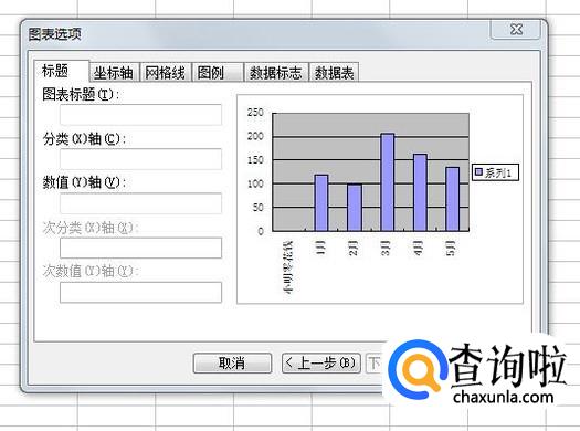 在图表选项的界面,可以设置标题、坐标轴、网格线、图例数据标志、数据表等项,根据自己的需要进行选择,输入好之后,点击右下方的完成按钮,柱状图就出现在Excel表格之中了。