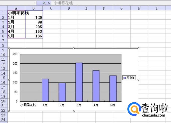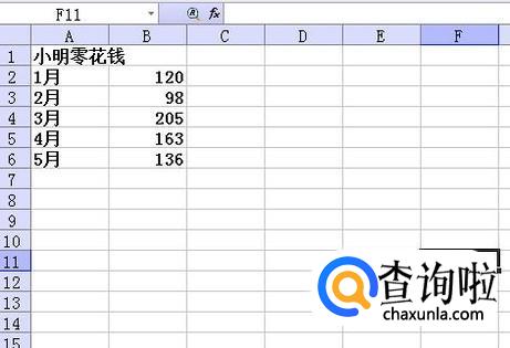 首先打开一个Excel空白表,在里面输入需要的数据,这里假设要编制小明1-5月份的零花钱柱状图,在每个月份的右侧输入相应的钱数。