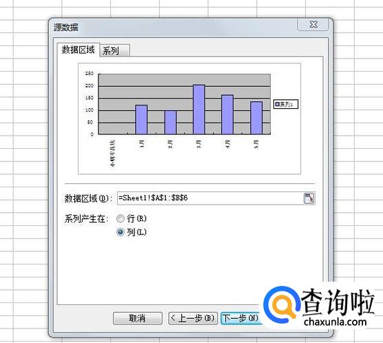在出来的源数据选项框中,可以选择系列产生在行还是列,选定之后,再点击下一步。