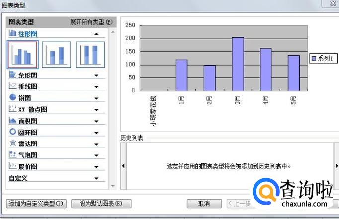点击之后,出来一个图标类型的选项框,找到柱状图,点击它,从右侧就可以看见预览图,然后点击下一步。