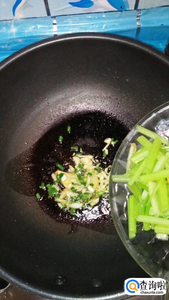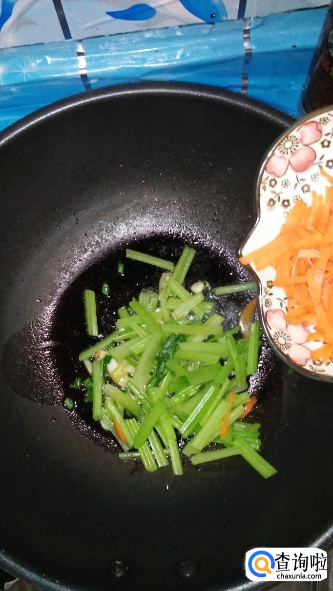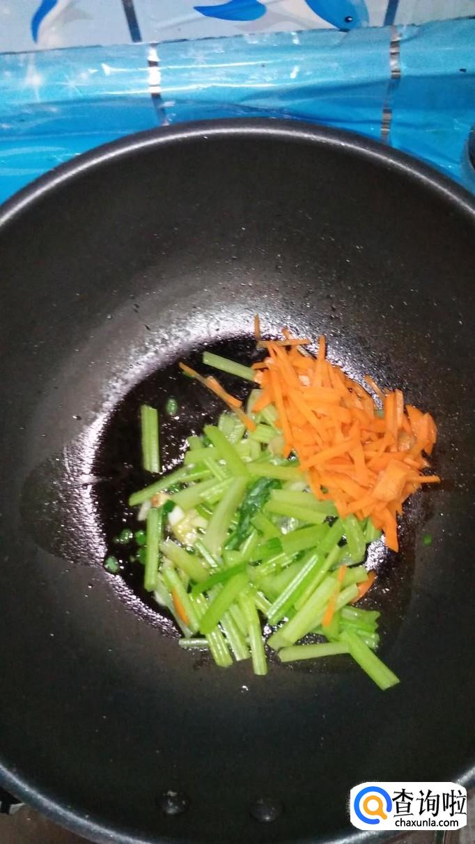 将焯好水的芹菜和胡萝卜放入锅中翻炒均匀。