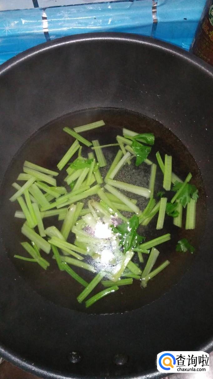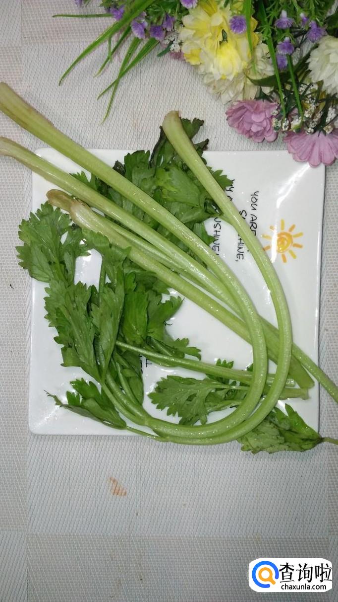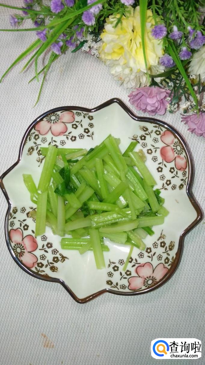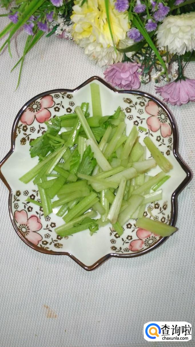 将芹菜放入开水中焯水,焯好捞出,放入盘中备用,芹菜焯水的时间也不能过长,否则颜色会变黄,影响色泽。