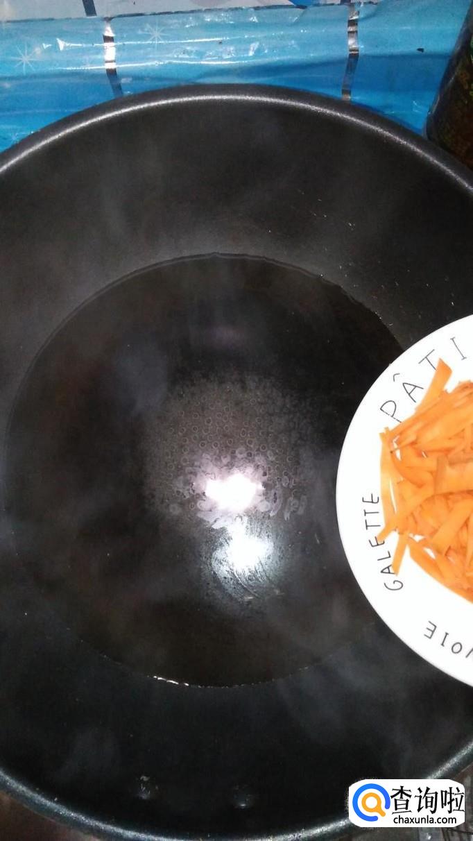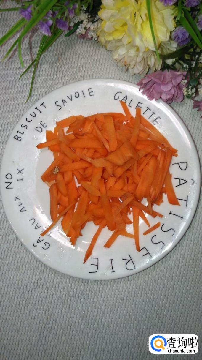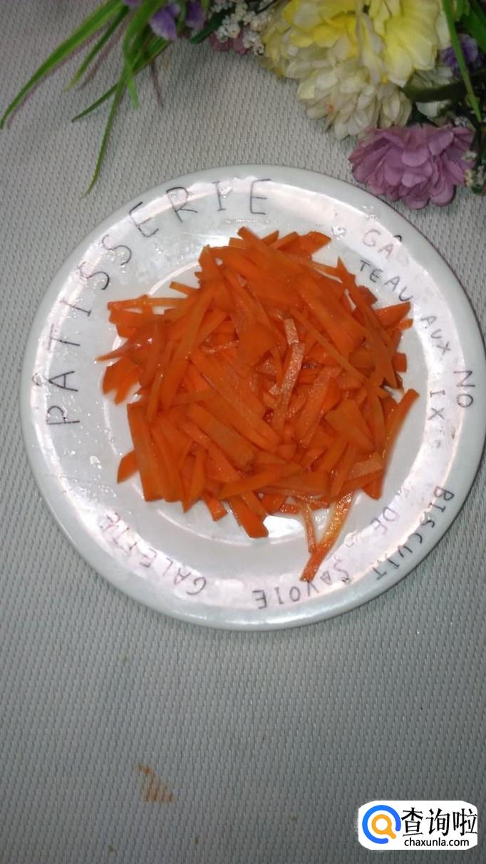 锅中烧开水,水开后将胡萝卜放入锅中焯水,焯好后捞出,放入盘中备用,胡萝卜焯水的时间不能过长,丝状的胡萝卜很容易熟。