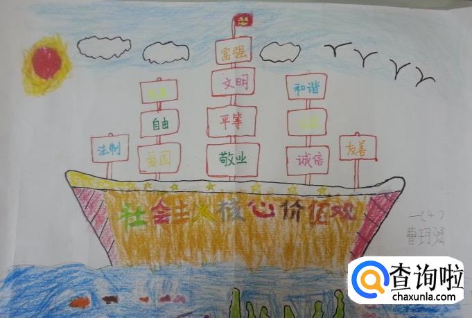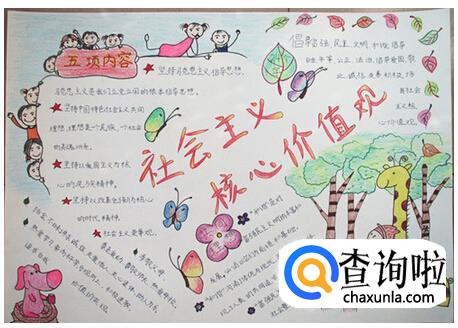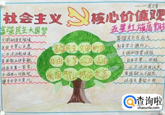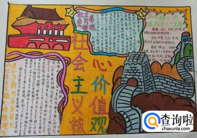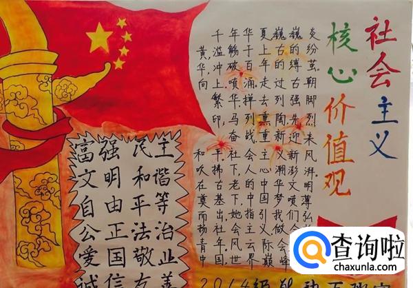 左边画上鲜红的国旗,右下角画上党旗,然后配上核心价值观的文字,可以在文字下面做一些背景画,手抄报看起来特别光彩。