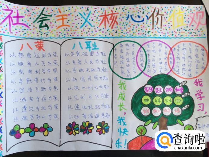 顶上写上社会主义核心价值观,用彩色笔画一些点点装饰。左边用一本书的形式展开八荣八耻,右边一半作画,一半用文字来呈现。