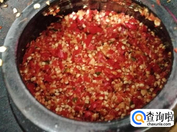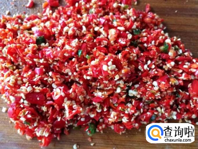将小米辣剁碎。如果辣椒比较多,可以用专门绞辣椒的机器绞碎。