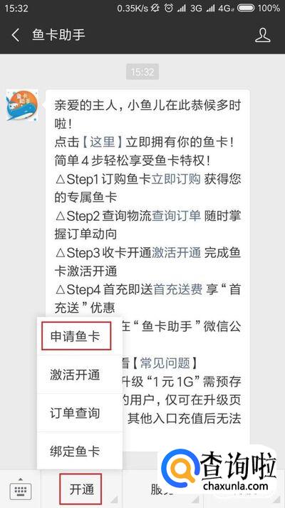 接下来,在打开的公众号页面中,点击“开通-申请鱼卡”菜单。
