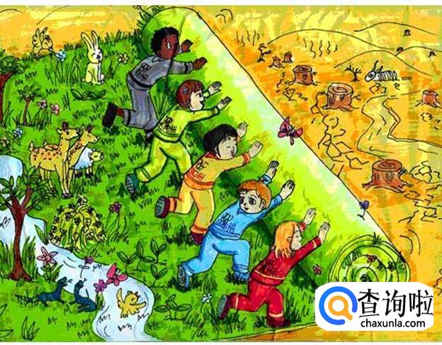 光秃秃的山顶,任人摧残的动植物,和山清水秀的家园,形成强烈对比,呼吁人们保护环境。