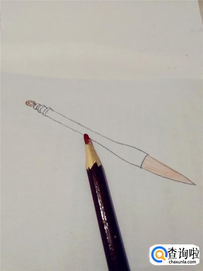 准备纸、铅笔、彩笔。毛笔一般分为笔上的绳套、笔杆、笔尖几部分,画的时候先画笔上的绳套。