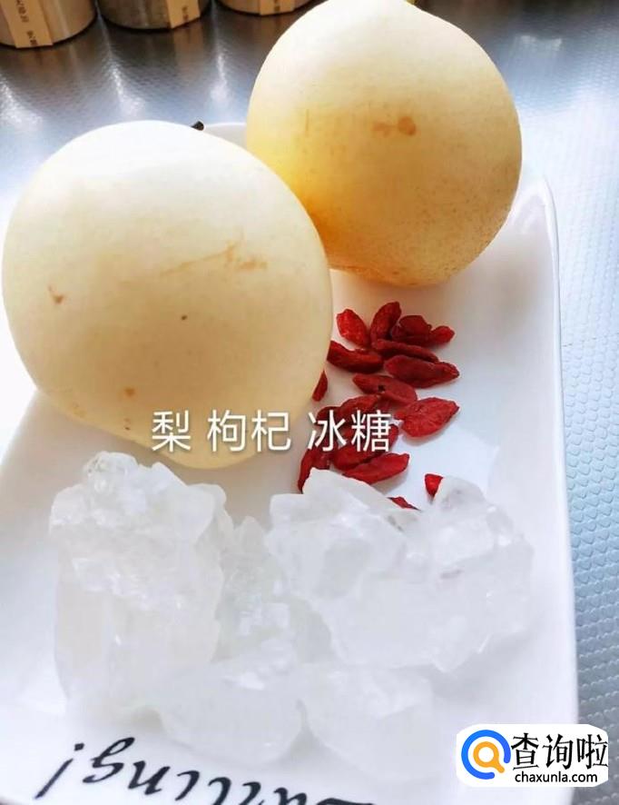 准备好制作冰糖雪梨水的材料,如下图所示。小贴士:1.关于梨的选择,小编建议大家最好选择白梨会比较好;2.枸杞准备十克左右;3.冰糖准备两大块。