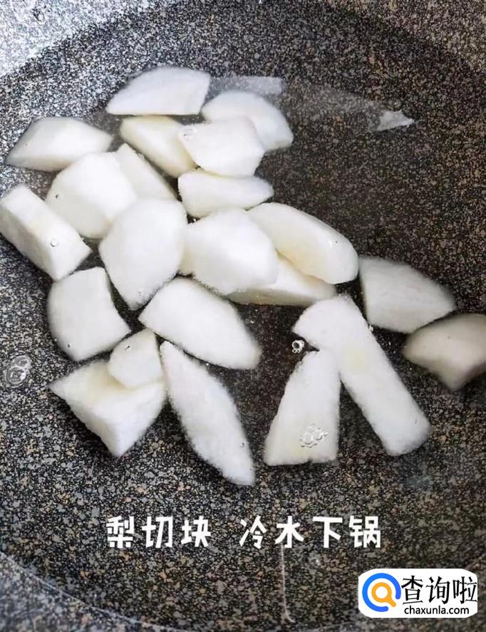 接着锅中放入适量的清水,把切好的白梨倒进去,如下图所示。小贴士:煮梨的时候,必须冷水下锅,这一点大家一定要注意。