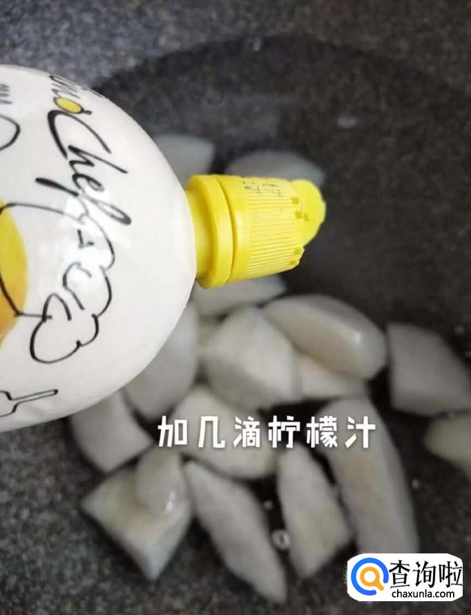 然后往锅中滴入几滴柠檬汁,如下图所示。