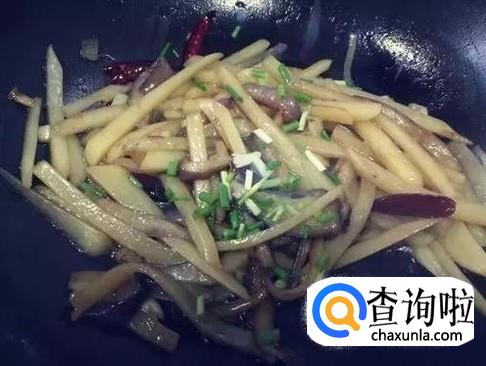 焖到变色后加入葱花进行翻炒。
