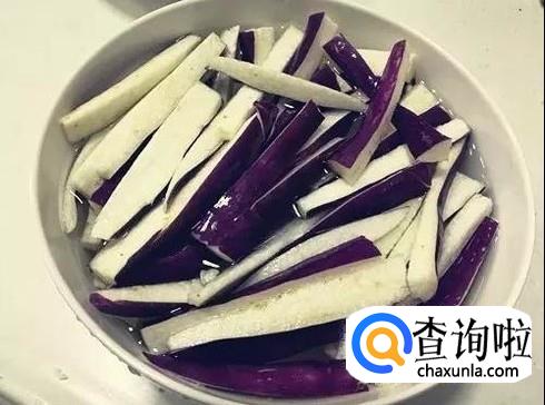 将茄子洗净,切成长条泡在水中备用。