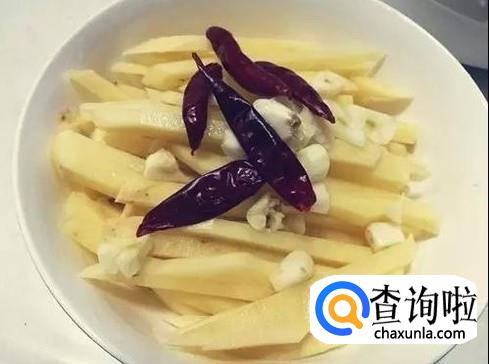 土豆也切成长条,大蒜切成小片备用。