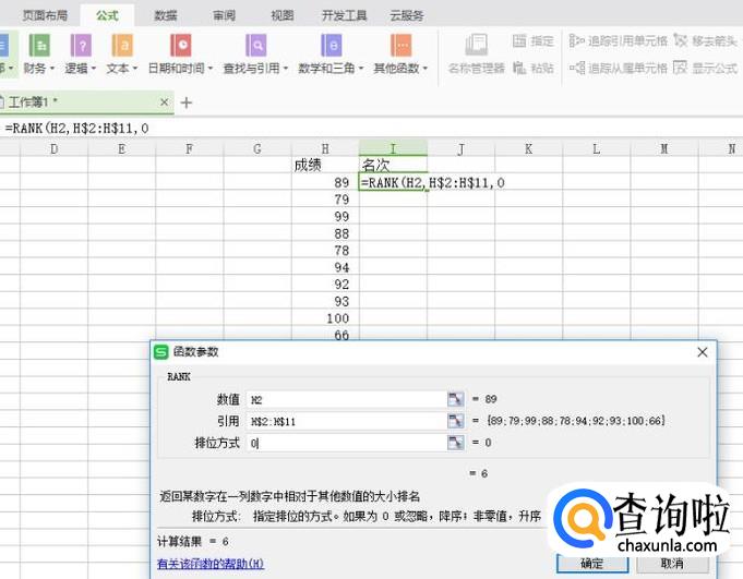 然后在搜索框输入RANK,选择RANK后 点击确定,然后在第一个输入框中输入需要统计名次的单元格位置(比如H2),在第二个输入框中输入全部数据的位置(比如H2:H11,为绝对引用的意思),在第三个输入框中输入0,然后点击确定