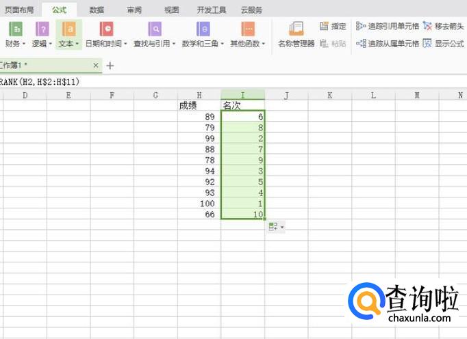 首先我们输入需要统计的数据,然后选中统计名次的单元格,并且点击 公式 选项