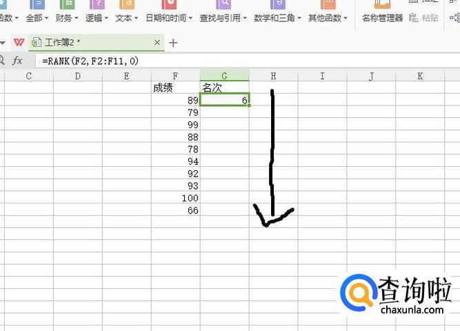 回到页面后就会生成第一个成绩的排名了,我们点击表格右下角向下拖动即可完成所有成绩的排名。