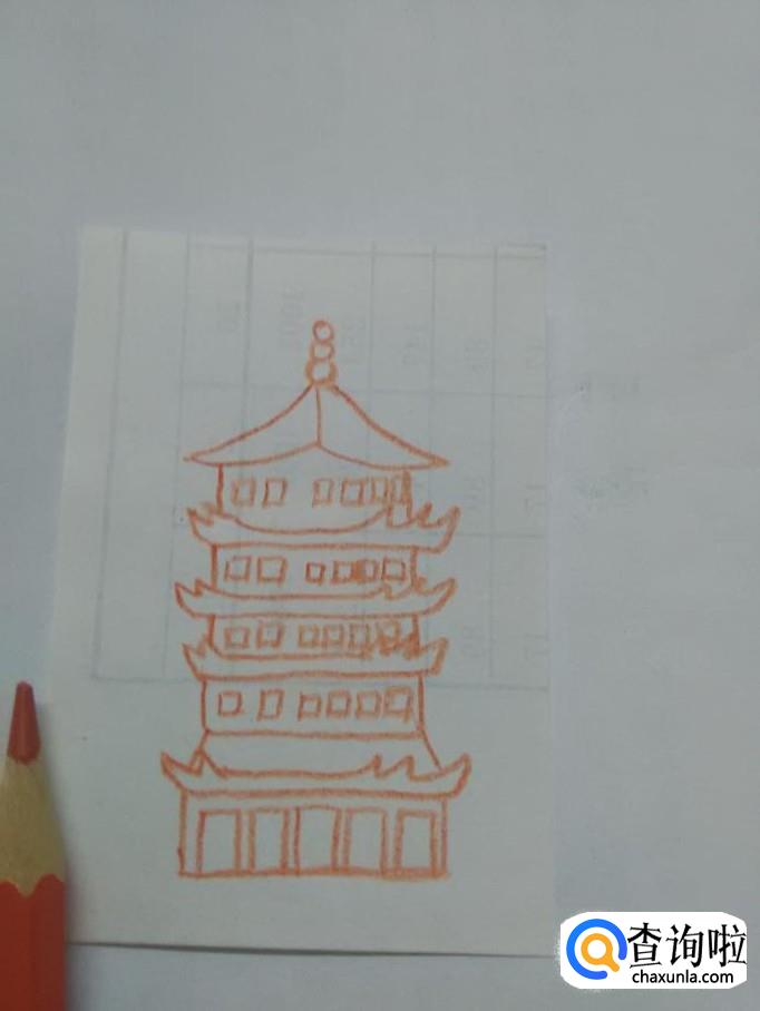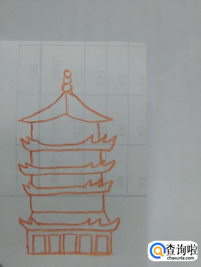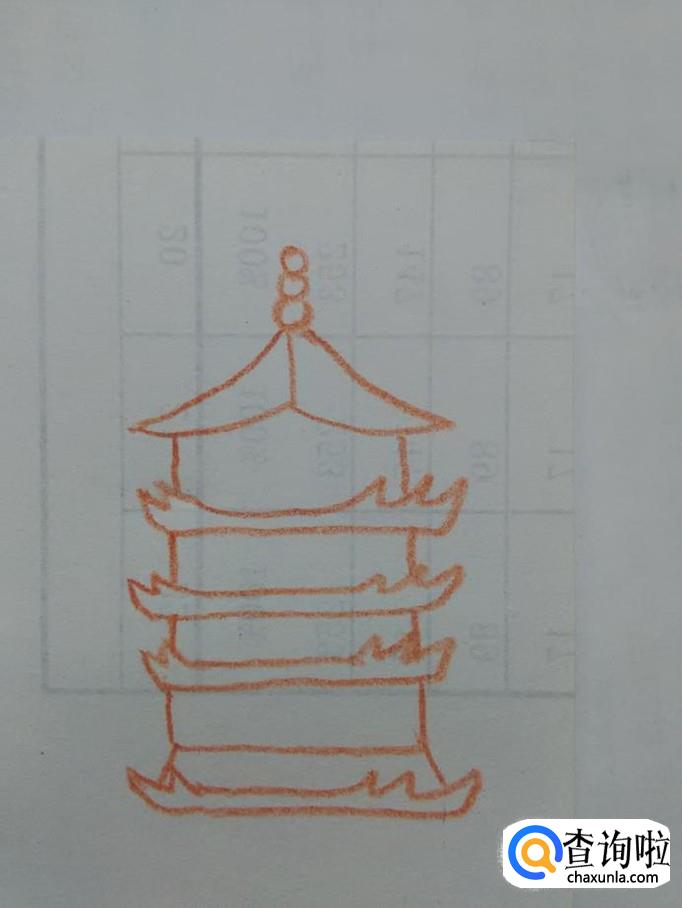 在最高层塔下面重复画三次这样的塔和塔檐,但是最下层要多出两条斜线。