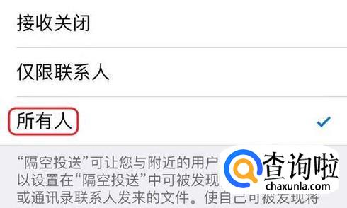 在通用页面里我们就能看到“隔空投送”选项了,不过很早之前的版本是叫AirDrop的,其实两者是一样的,在隔空投送界面我们勾选“所有人”;