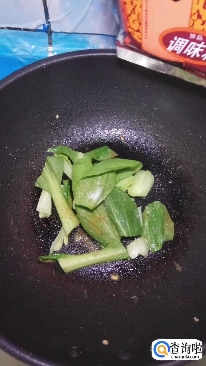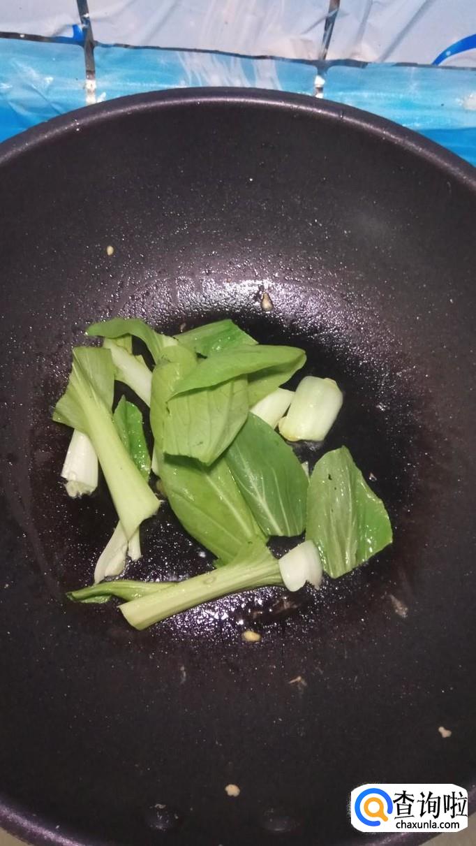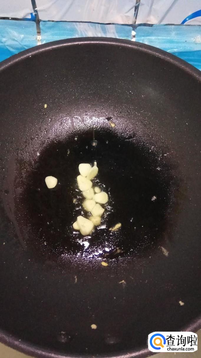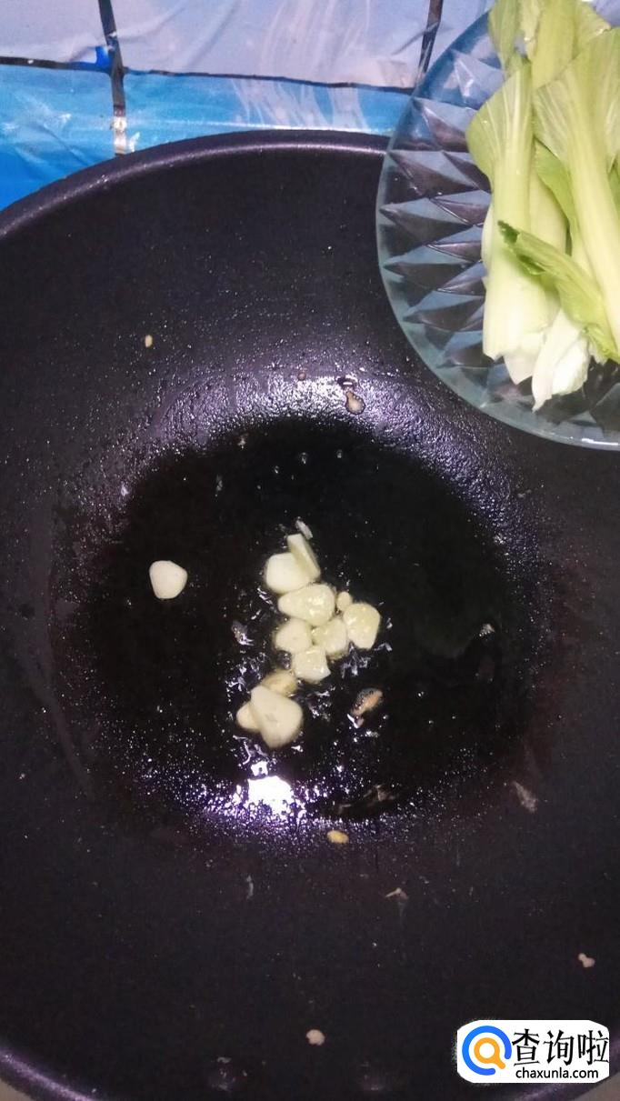炒锅中再放入少许油,将蒜片放入锅中炒香,然后将青菜倒入锅中翻炒一下。