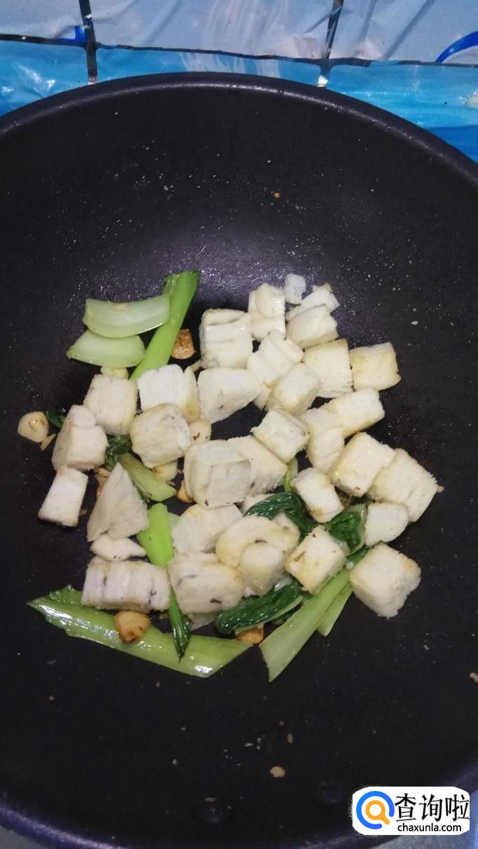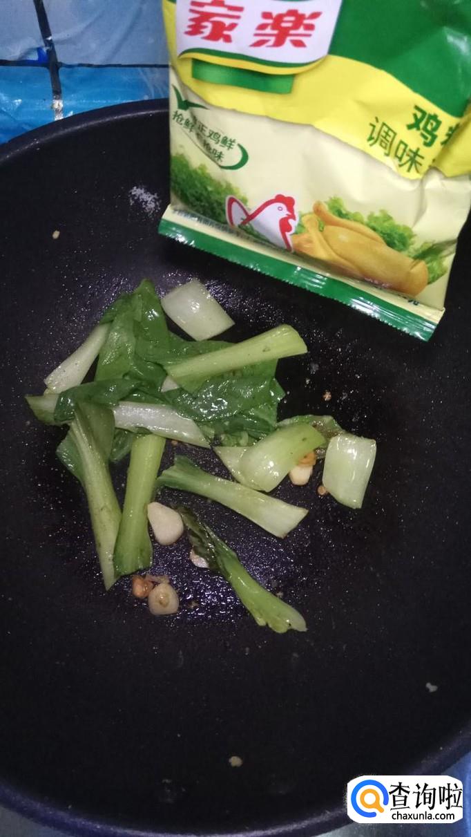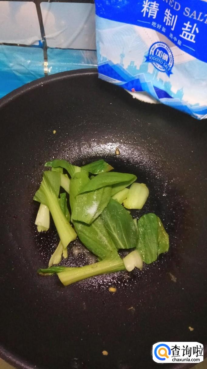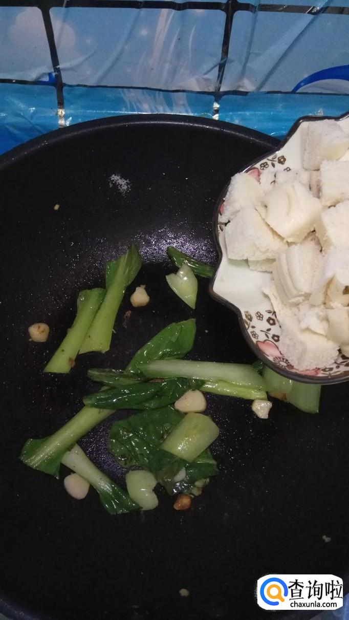 炒锅中再放入少许油,将蒜片放入锅中炒香,然后将青菜倒入锅中翻炒一下。
